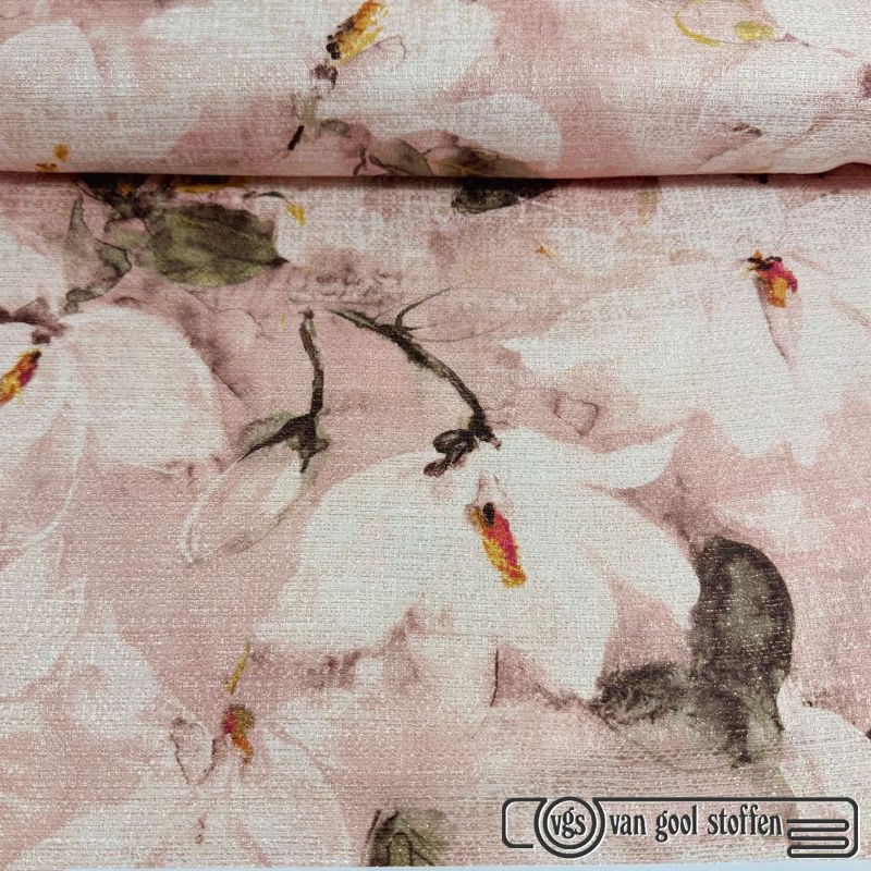 Grof geweven mantelpak stof bloemen print oud rose met goud lurex