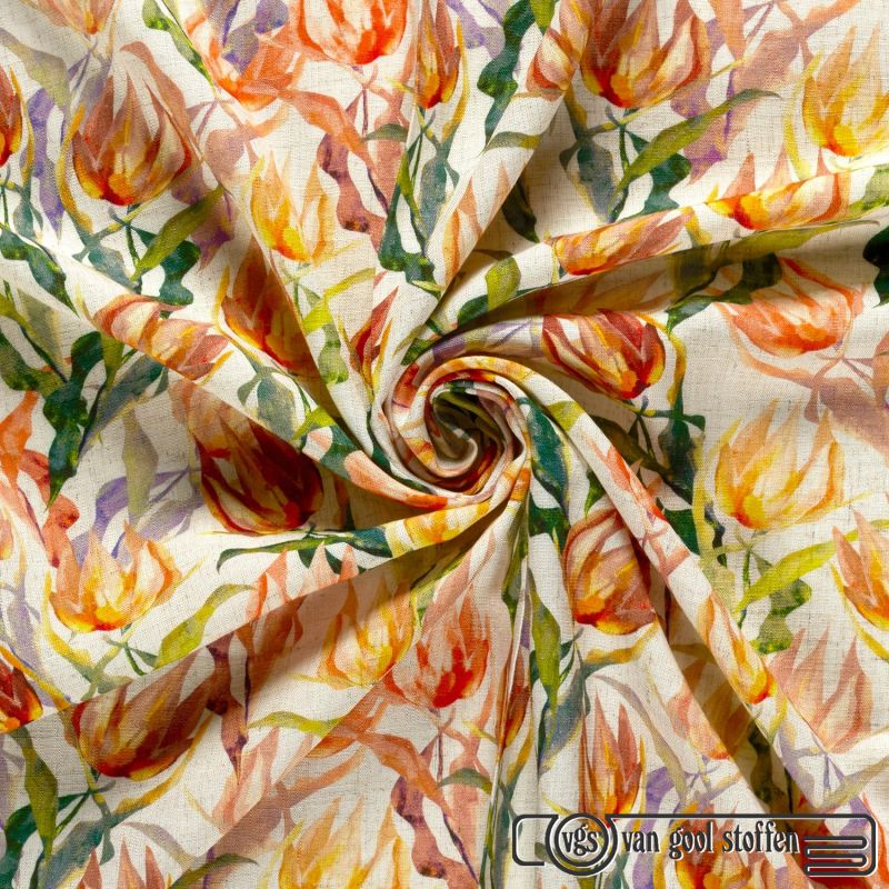 Stretch satijn bloemen print oranje burgundy A la Ville / knipmode