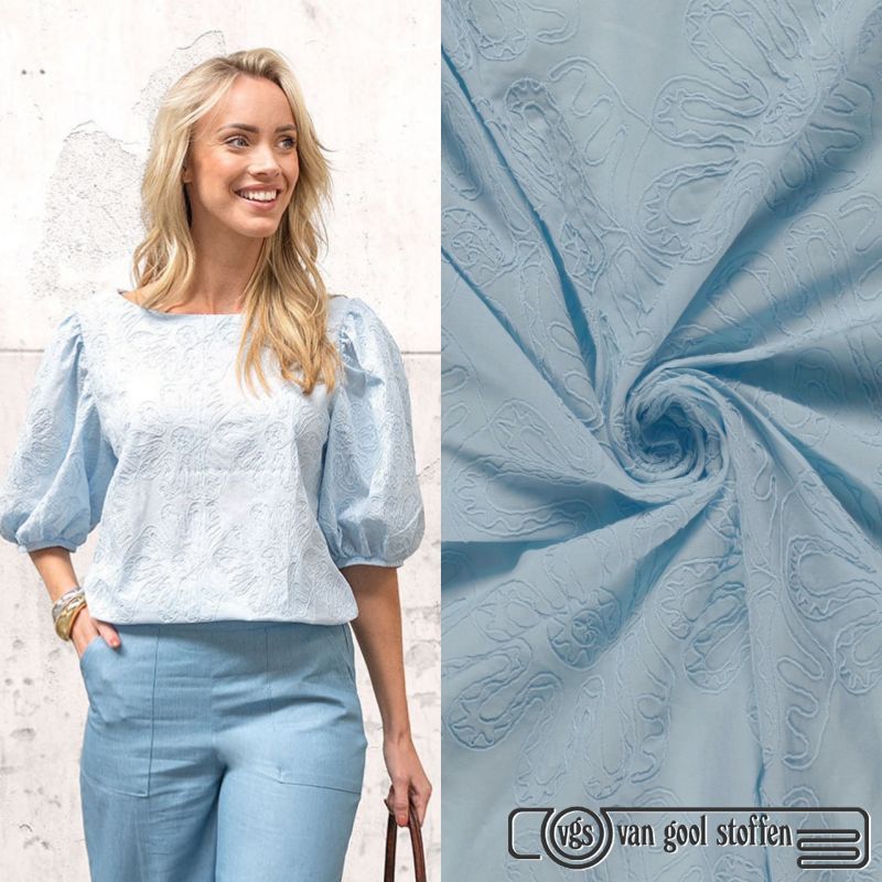 Deze prachtige 100% katoenen stof met borduursel combineert natuurlijke zachtheid met een verfijnde uitstraling. Het subtiele borduurwerk geeft de stof extra karakter en maakt elk kledingstuk nét dat beetje specialer. Perfect voor stijlvolle creaties uit het My Image patronenblad.