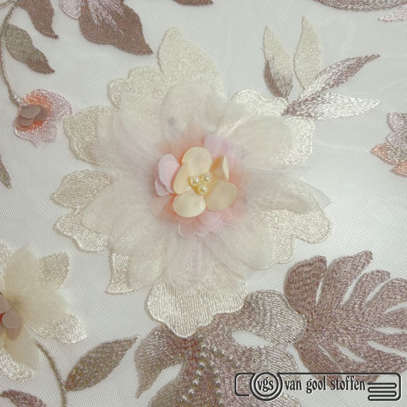 Deze exclusieve stretch tule is rijk gedecoreerd met prachtige 3D bloemen in zachte pastelkleuren zoals geel, zalm, licht rosé en taupe. De bloemen zijn verfijnd afgewerkt met pareltjes en kraaltjes, wat zorgt voor een luxueuze en romantische uitstraling.