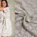 Deze elegante mesh stof in ivory met zilveren pailletten geeft elke outfit een feestelijke en luxe uitstraling. De fijne mesh structuur is licht doorschijnend en is rijkelijk versierd met subtiel glanzende zilveren pailletten, waardoor de stof prachtig schittert in het licht.