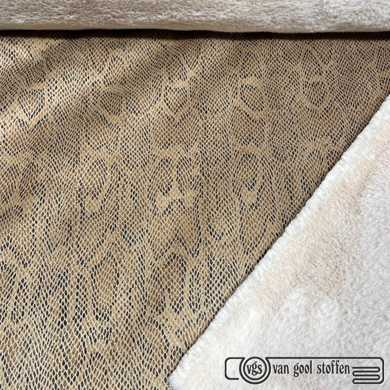 Coupon 095x145lammy coat stof slangen print double face suedine met bont beige