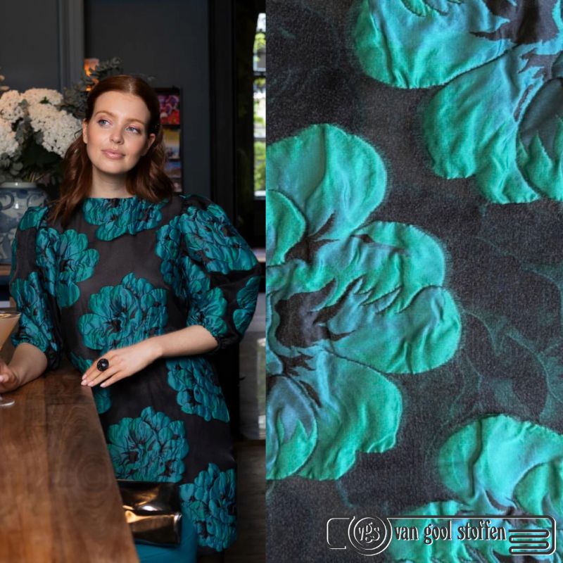 Coupon 65x150organza met bloemen petrol A la ville / knipmode