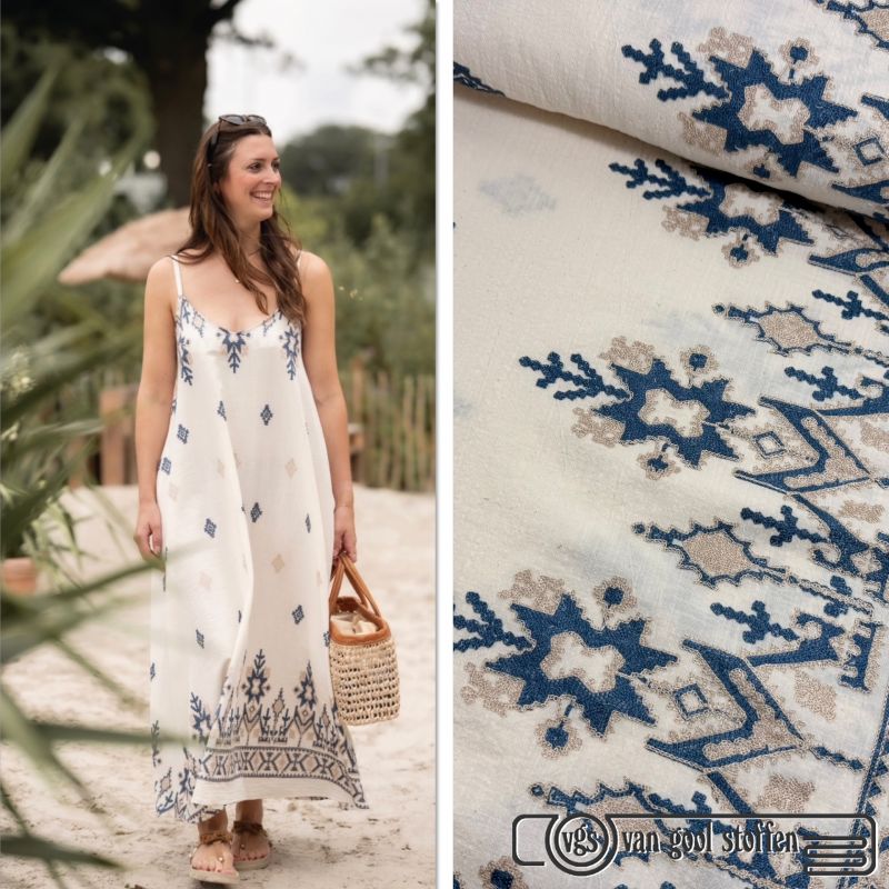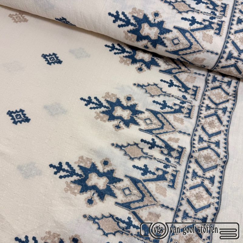Linnen look katoen met geborduurde border creme kleur