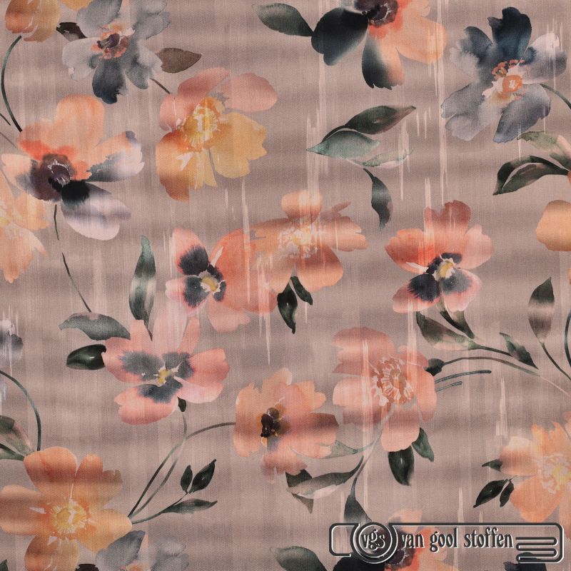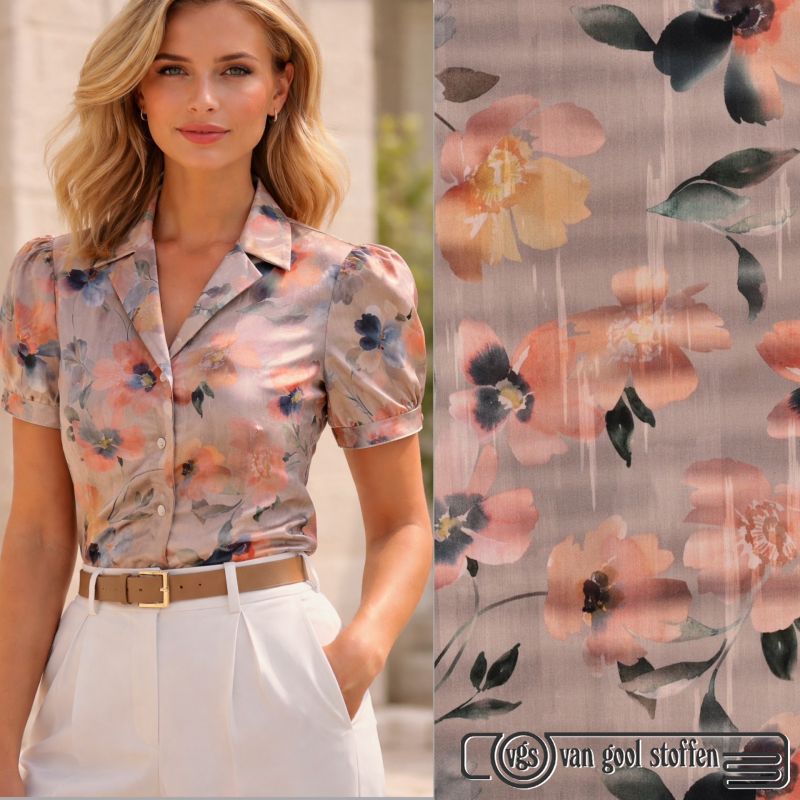 katoen satijn met bloemen print taupe zalm