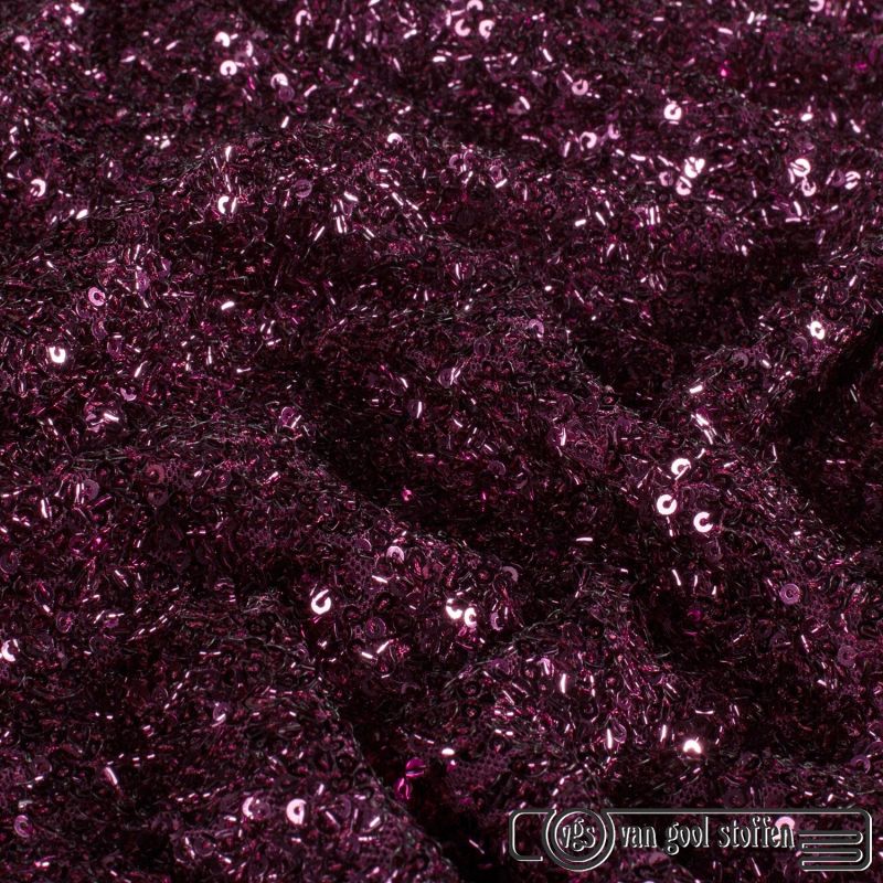 Mesh stof met pailletten en kraaltjes – paars rood / aubergine