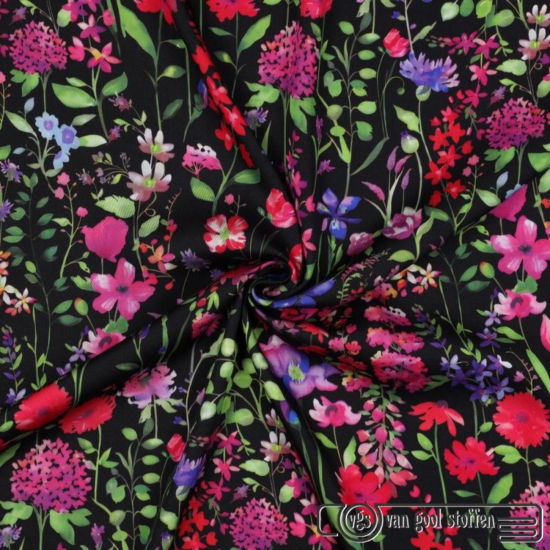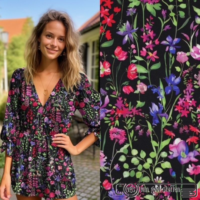 Exclusieve geborduurde grof geweven mantelpakjes stofzwart met rozen