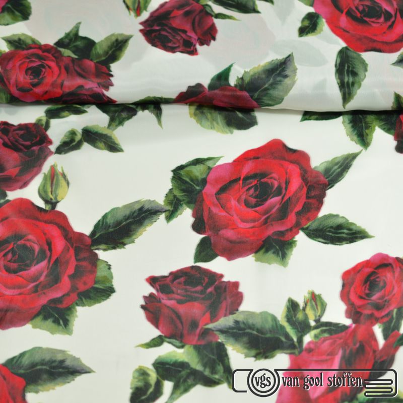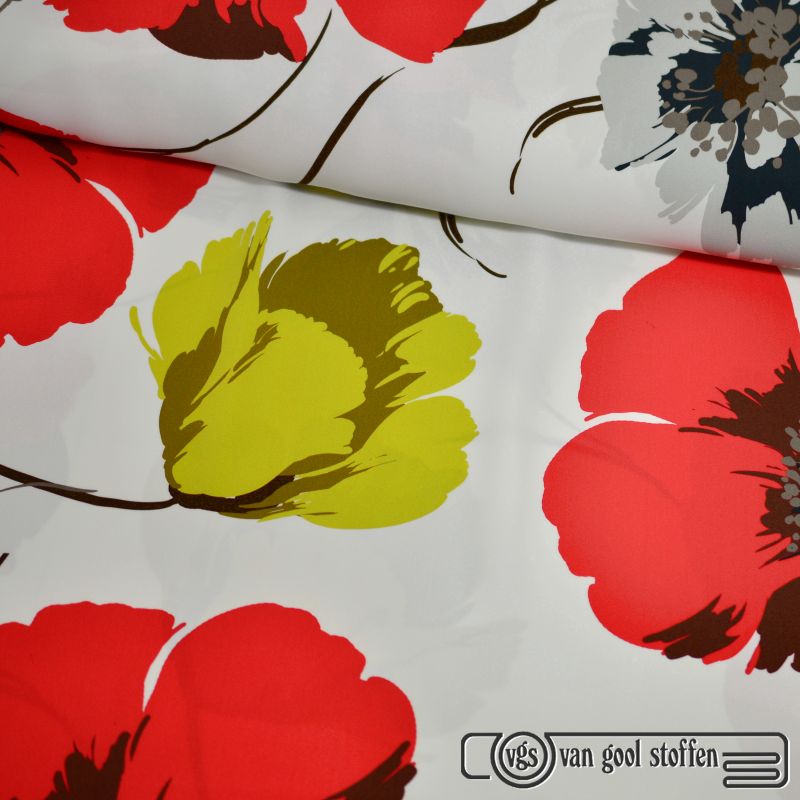 Viscose crepe bloemen ivoor rood ecovero exclusieve italiaanse designer stof