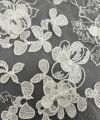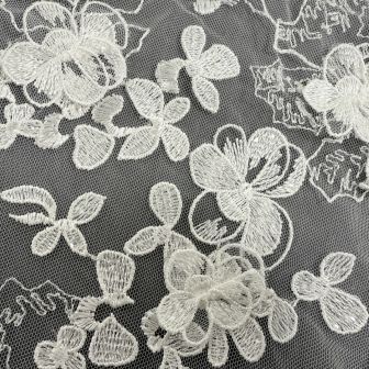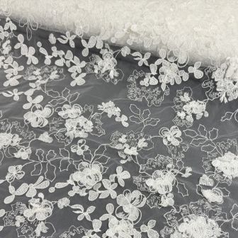 Maak een statement met dit uitzonderlijke haute couture 3D kant. Op een zachte tule-basis zijn gelaserde ivory bloemen geplaatst en subtiel afgewerkt met parelaccenten — een combinatie die direct luxe, diepte en verfijning toevoegt aan elk ontwerp.