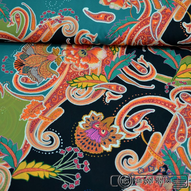 Een unieke, hoogwaardige Ecovero viscose uit Italiaanse deadstock. Deze dunne, soepelvallende stof heeft een stijlvolle barok uitstraling met een blauwe ondergrond en een verfijnd wit/off-white zonnegezicht-motief. Een echte eyecatcher met een luxueuze en creatieve uitstraling.