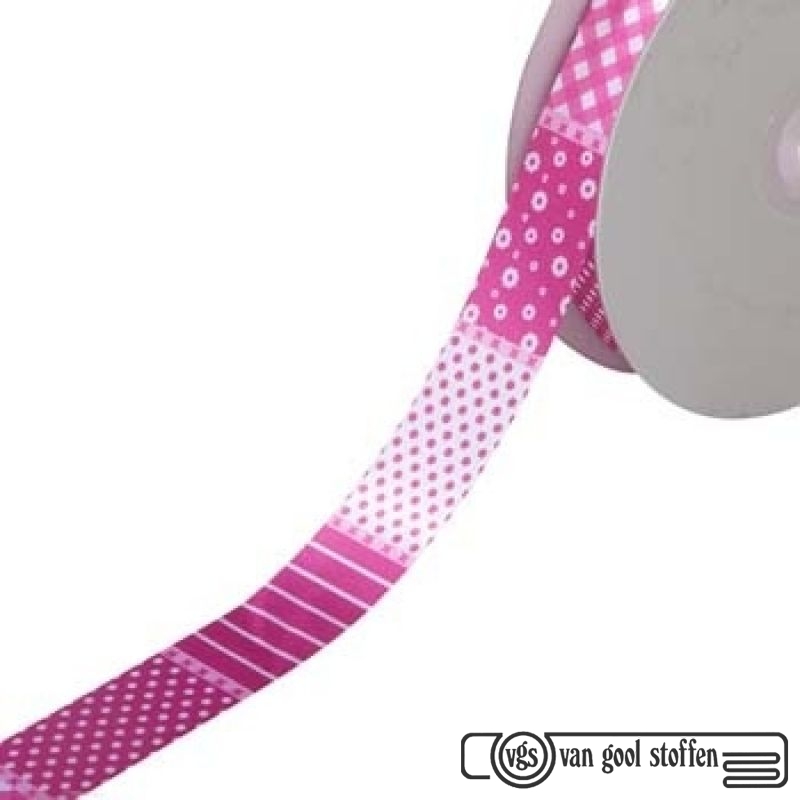 Satijnband 25 mm bedrukt patchwork fuchsia
