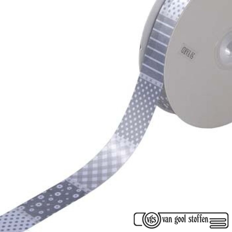 Satijnband 25 mm bedrukt patchwork grijs