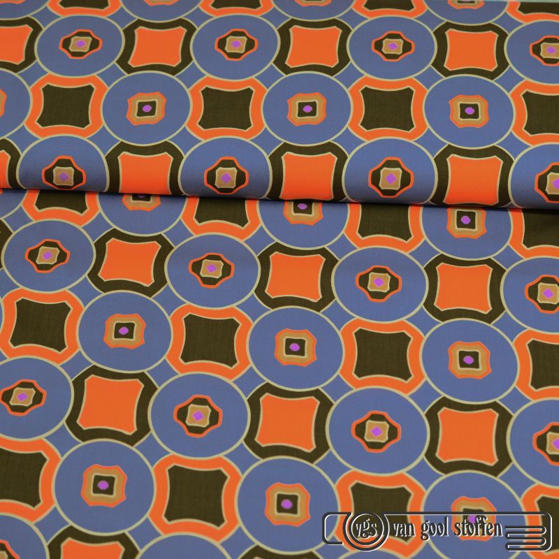 Poplin katoen abstract / retro print staal blauw oranje # a la ville knipmode