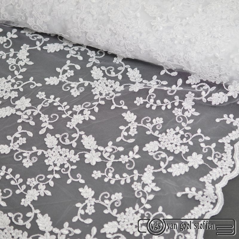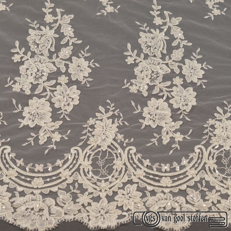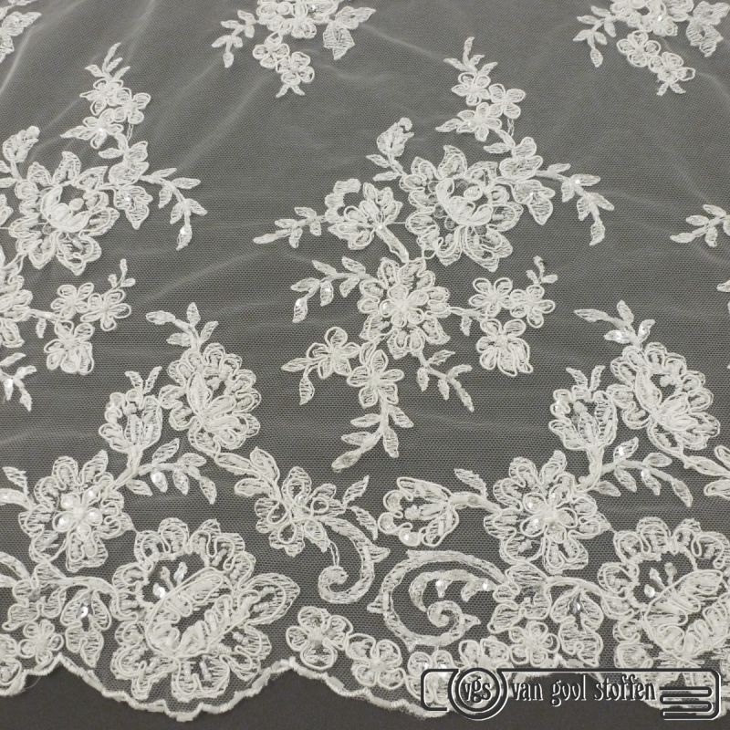 Exclusieve bruids kant dubbele bloementjes border rand en pailletten kleur 111 ivory