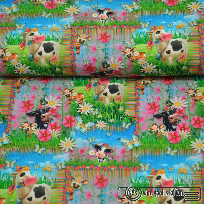 Tricot katoen digitaal vrolijke koe all over print