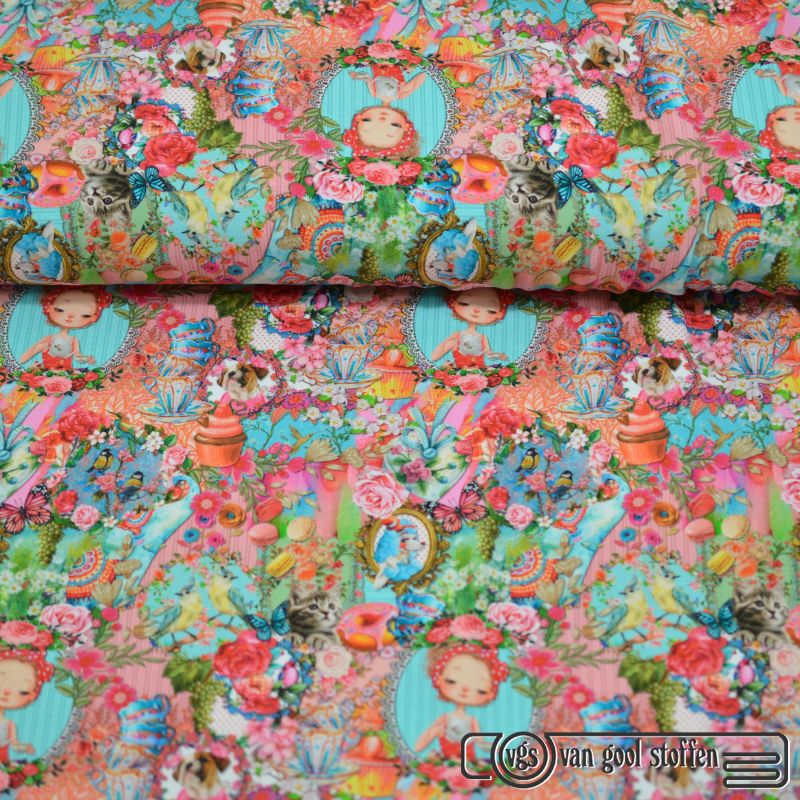 Tricot katoen digitaal cheerful look / hondjes en poesjes all over print