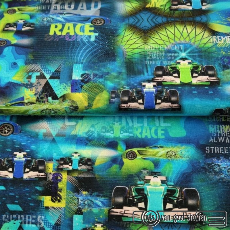 Tricot katoen digitaal race wagen over print