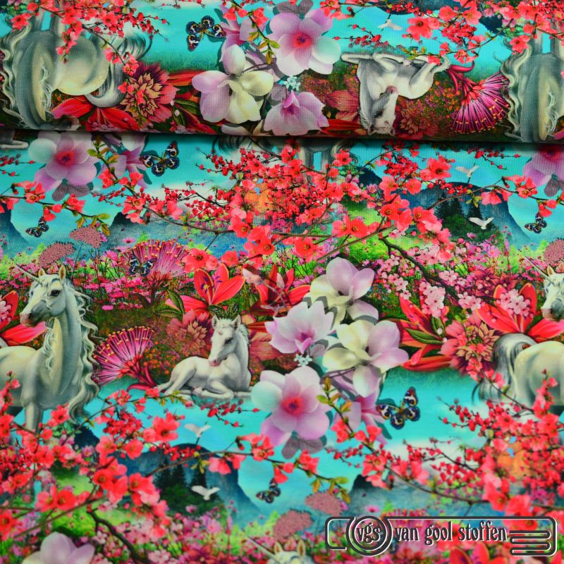 Tricot katoen digitaal print bloemen unicorn
