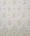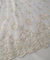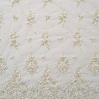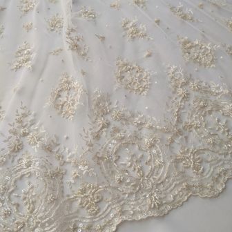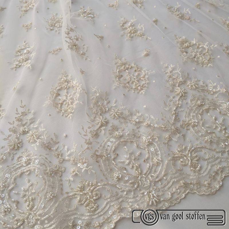 Haute couture kant basisdoek tule opgewerkt met pailletten en kraaltjes. Een zijde brede schulprand andere zijde smalle afgewerkte schulprand. Hoogte rand +/- 23cm.