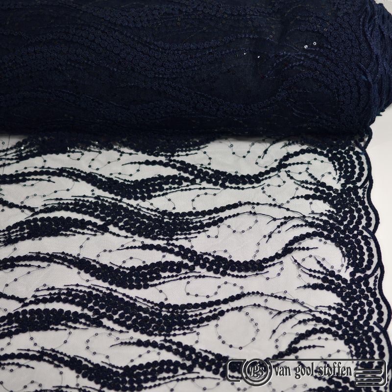 Exclusieve haute couture kant met pailletten donker blauw slinger motief