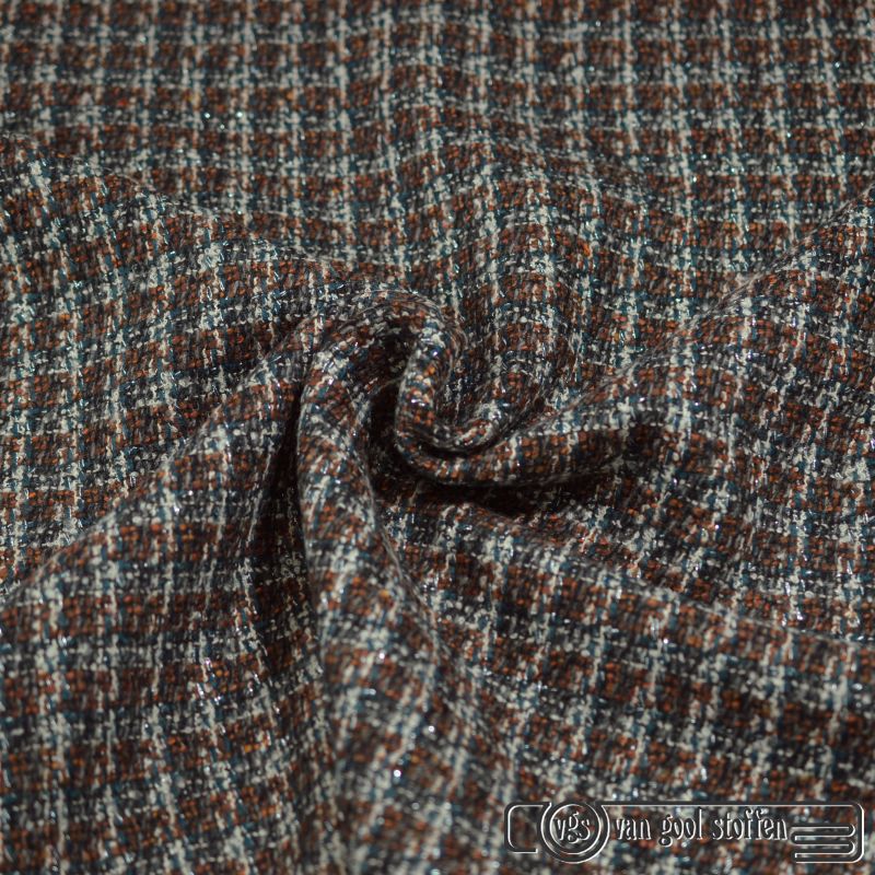Exclusieve grof geweven mantelpak stof italiaans design petrol brique met lurex draadje