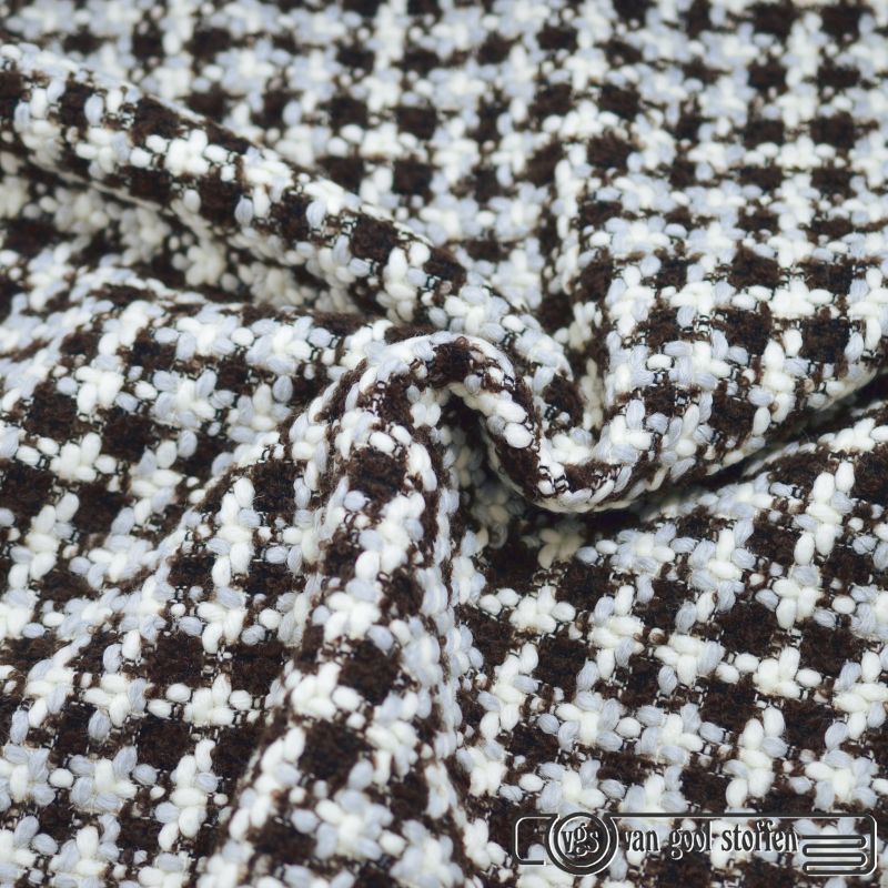 Exclusieve grof geweven mantelpak stof italiaans design bruin licht grijs ivory
