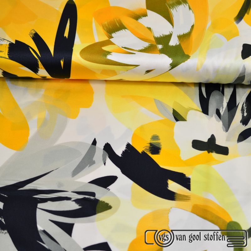 Stretch zijde katoen satijn geel grijs Exclusief uit Italië digitaal geprint
